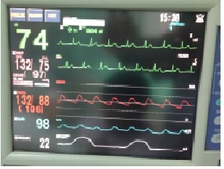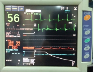 Hình 2. Màn hình với nhịp tim chậm dần, huyết áp tụt không đáp ứng với các thuốc vận mạch, Oxy tụt.