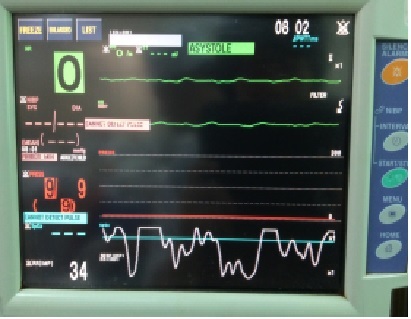 Hình 3. Màn hình với nhịp tim, mạch, huyết áp, oxy, nhịp thở không bắt được. Tuyên bố tử vong sau khi theo dõi 5 phút không có nhịp đập trở lại của tim.